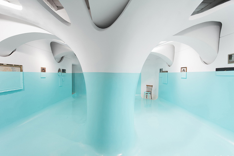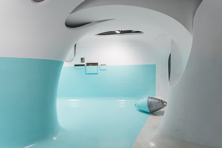 « Antivegetativa », the name of the exhibition, comes from the italian name of the blue pigment treated to destroy the growth of marine organisms like seaweed, corals and molds on ships. D’Elia applies a thick layer of anti-fouling paint on half of the spaces of the gallery, creating a surreal environment immersed in acidic abysses.
