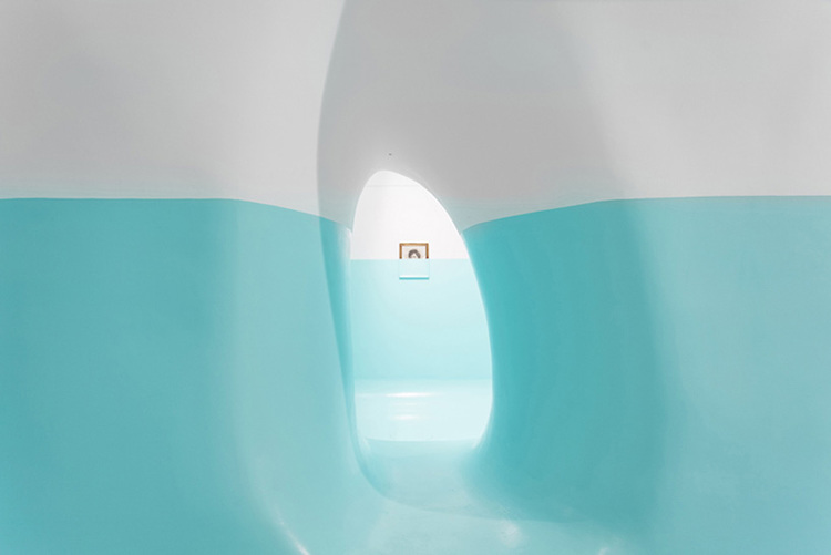Born in 1973, artist Davide D’Elia’s work invites us to consider the possibilities of time that passes and time that has passed. Using 19 canvases, a buoy, a chair and « tiffany blue » colored anti-fouling paint, Italian artist turns a gallery interior into a hall-immersed painted landscape.