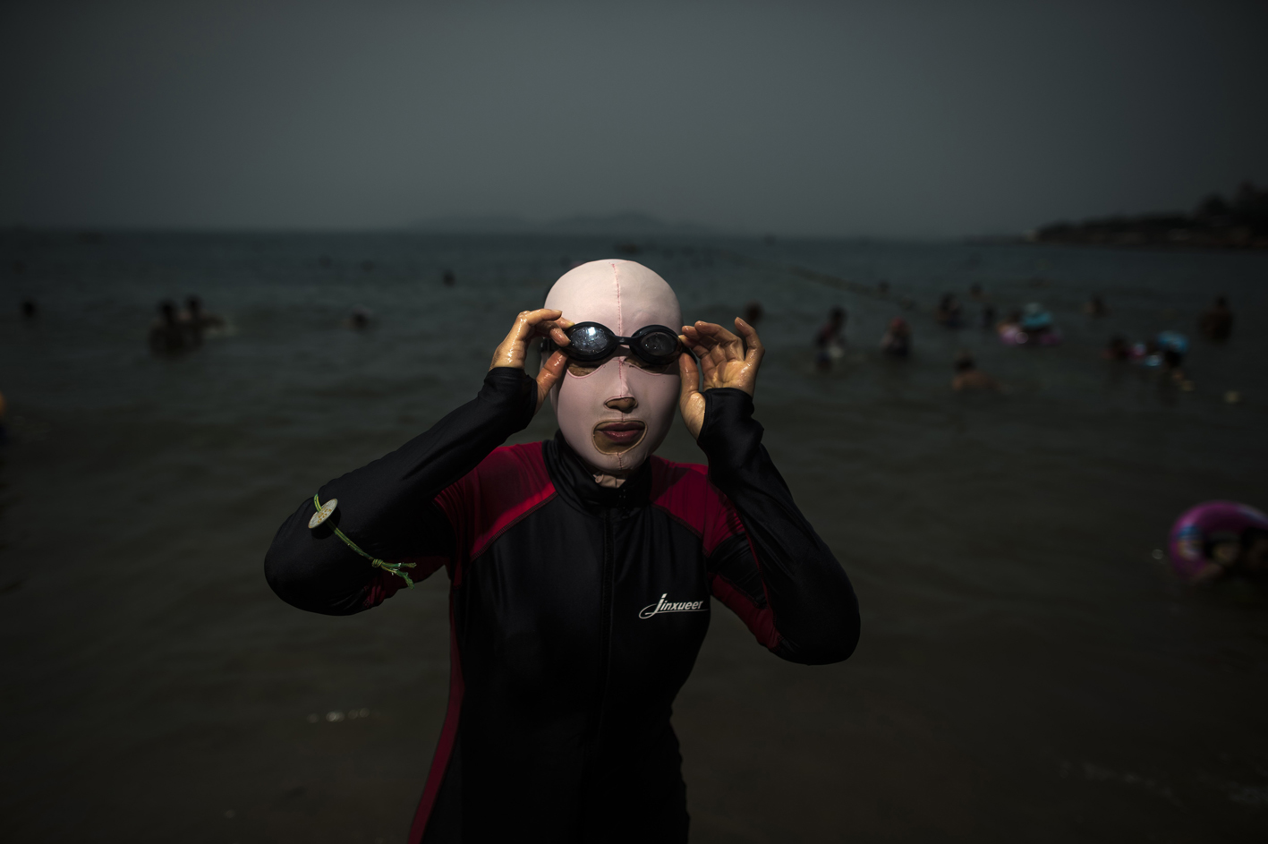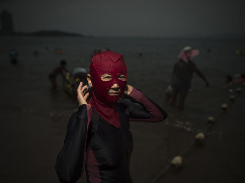 In 2004, the Face-Kini appeared on the beaches of the coast city of Qingdao in China, a popular tourist destination for many Chinese seeking to escape the summer heat. Covering the entire face except the eyes, nose and mouth, the face-kini is often worn by retired local women who frequently swim in the city's oceans, and who look to protect their delicate porcelain skin from the sun.