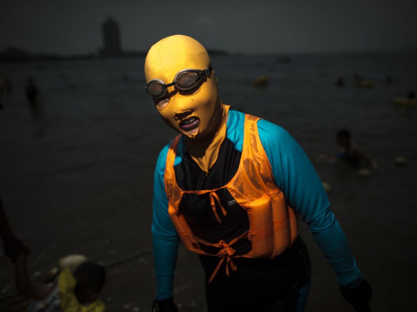 Over the last decade, the synthetic mask has helped cautious beach lovers to maintain a pearly-white complexion. The masks are made from a durable swimsuit material of stretch lycra and nylon, and sell for $2-4, however many women make their own mask by hand, using old underwear and swimsuits. With summer coming, forget chairs, umbrellas, coolers, and tents. Here is your new swim toy.